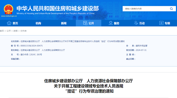 住建部聯(lián)合人社部發(fā)布《關(guān)于開展工程建設(shè)領(lǐng)域?qū)I(yè)技術(shù)人員違規(guī)“掛證”行為專項治理的通知》: